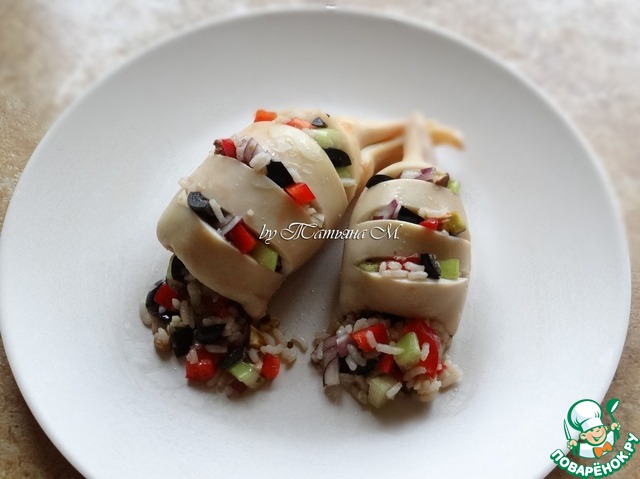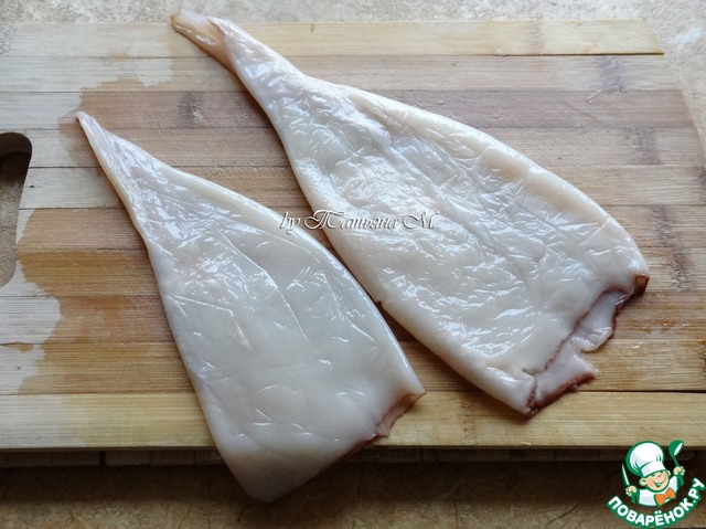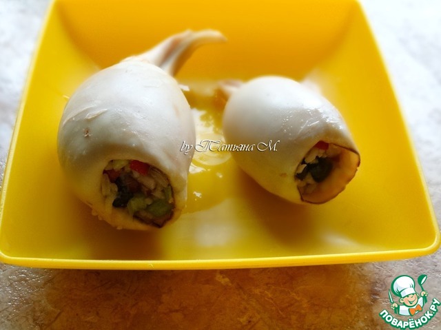 В тушках кальмаров сделать надрезы, так, чтобы было видно начинку (можно доложить в разрезы немного начинки);