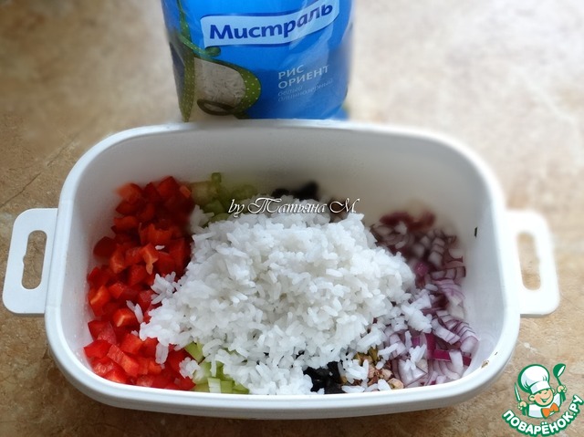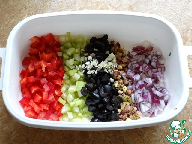 Порезать кубиками овощи, маслины, порубить фисташки и чеснок;