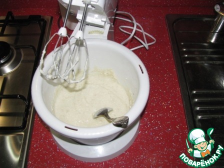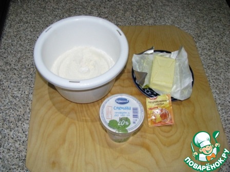 Просеиваем муку с разрыхлителем. Смешайте размягченный (не растопленный!) маргарин со сметаной, затем всыпьте смесь из муки и разрыхлителя