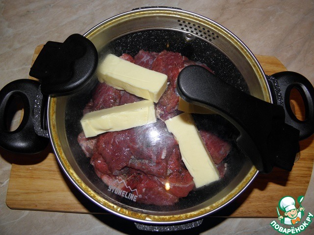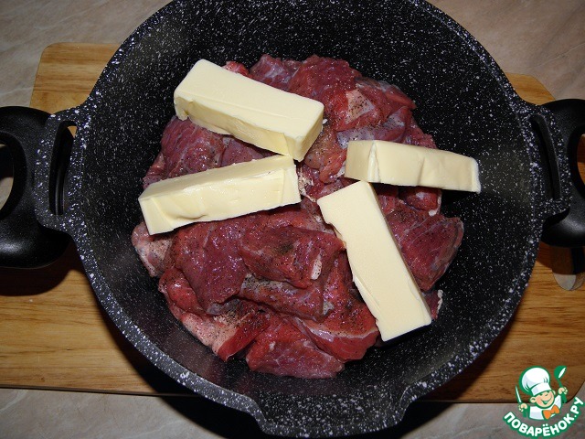 Мясо сложить в кастрюлю ( кастрюля должна быть хорошая, с толстыми стенками и дном), посолить, поперчить ( если не хотите сразу, специи можно добавить в процессе тушения), добавить сливочное масло