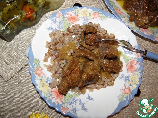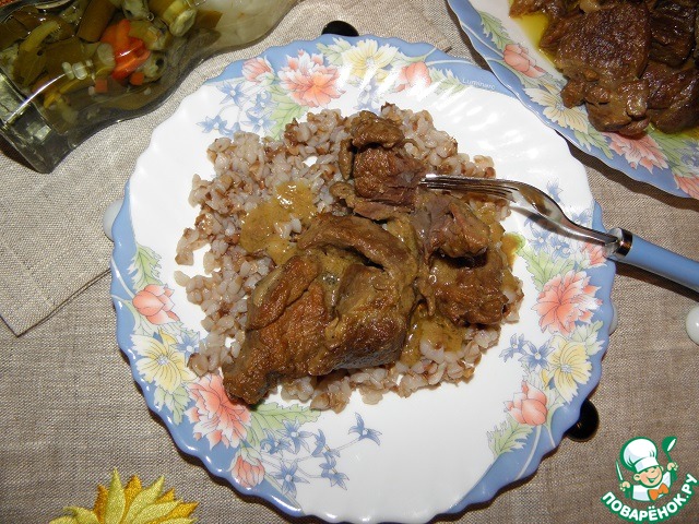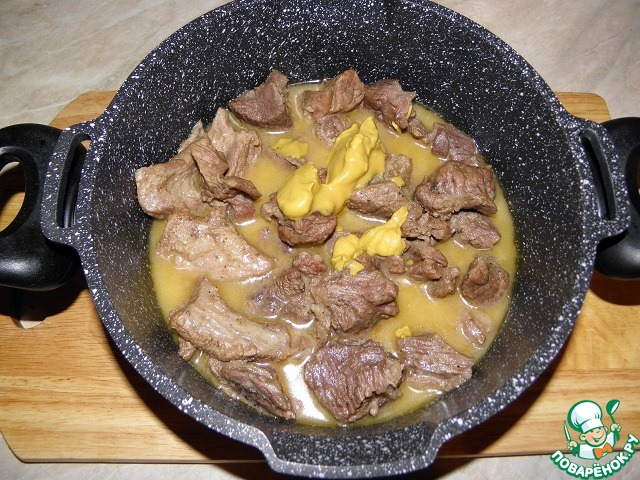 По истечению времени, добавить к мясу горчицу, лавровый лист и перец горошком, все перемешать, и тушить еще минут 30-40. После этого выключить огонь, и дать настояться мясу минут 15