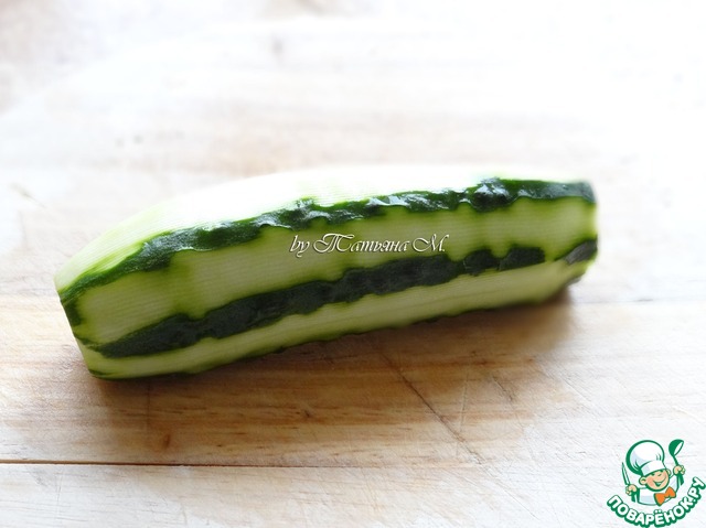Тем временем огурец помыть и очистить от кожуры, уставив небольшие полоски;