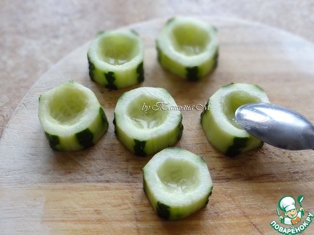 Порезать огурец на части и ложкой вынуть сердцевину, оставив тоненькое донышко;