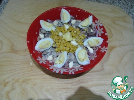 Перед подачей украсить салат яйцами и кукурузой, или горошком, если посчитаете нужным, посыпать петрушкой или кинзой, и опять-же точечно украсить майонезом.