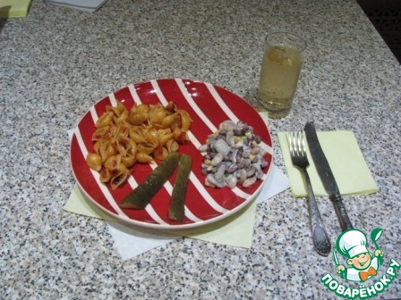 Можно подать и как отдельный гарнир, и как закуску. В моем случае это макароны обжаренные с луком и томатным соусом.