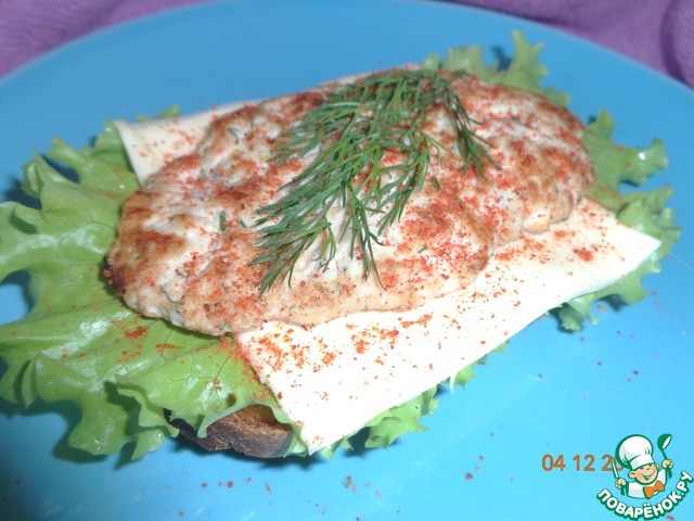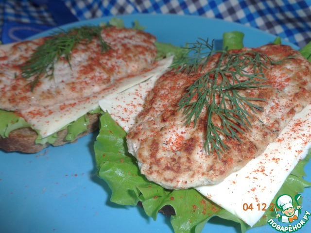 Собираем бутерброд. На ломтик ржаного хлеба кладем листья салата. На салат ломтик сыра. Затем нашу котлетку. Украшаем веточкой укропа и посыпаем красной сладкой паприкой.