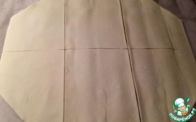 Возьмите тесто. Пласт тонкого слоёного теста. Я разрезала его на 6 частей.