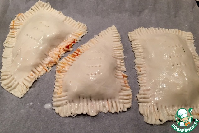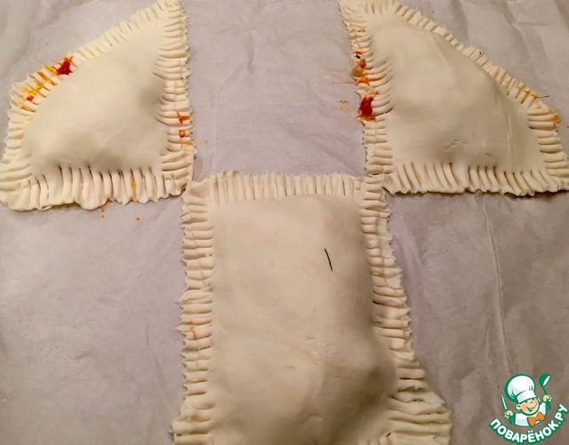 Аккуратно закройте края наших конвертиков вилкой! Получится красиво и начинка не просочится.
