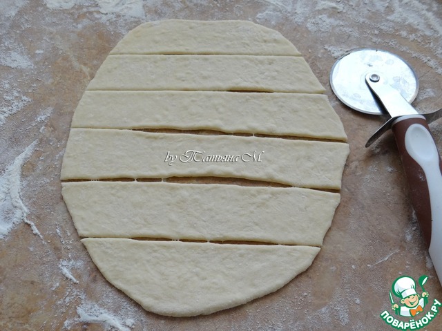 Из оставшегося теста раскатать пласт, который разрезать на полосы;