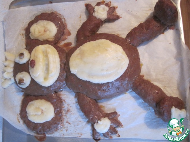 Оформляем обезьяну картофельным пюре. В глаза вставляем грибы. Запекаем в духовке при 200* 15 мин. Вставляем язык из моркови.