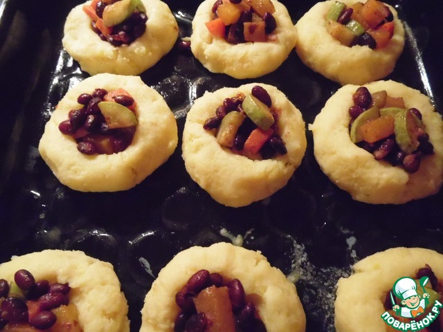 Из картофельного теста сформировать шарики, выложить их на смазанный сливочным маслом противень. Пестиком сделать в них углубления, выложить начинку. Духовку разогреть до 180°, запекать 15 минут.