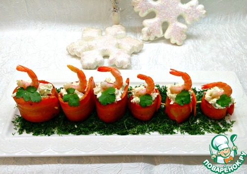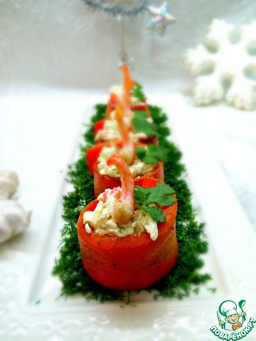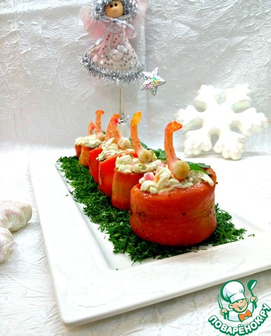 | Оригинальная закуска из моркови с креветками и сыром. |