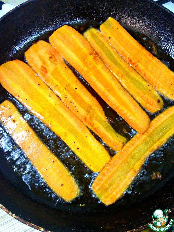 Обжарить морковь на растительном масле по 3 минутки с каждой стороны. Выложить на тарелку и накрыть пакетом.