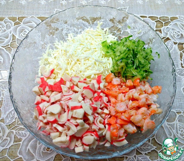 Брынзу натереть на мелкой терке, если мягкая, то просто размять вилкой. Крабовое мясо мелко нарезать (можно использовать крабовые палочки). Креветки очистить, отложить несколько для украшения, остальные порезать. Половинку огурца натереть на мелкой терке. Смешать, добавить майонез и тщательно вымешать до однородности.