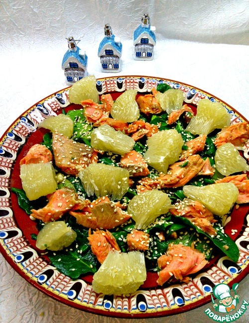 Сверху на шпинат выложить рыбу вместе с маринадом и кусочки помело. Посыпать кунжутом.