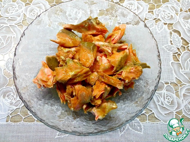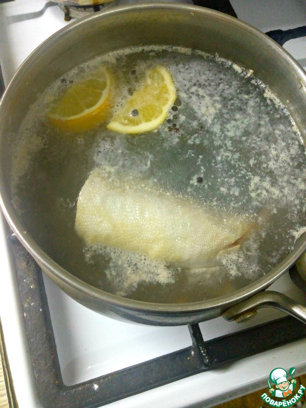 Рыбу, в моем случае горбуша, (можно использовать семгу, форель, кету, нерку) отварить в слабо кипящей воде 7-10 минут с добавлением пары долек лимона и перца горошком. Рыбу немного остудить, снять кожу, удалить кости.