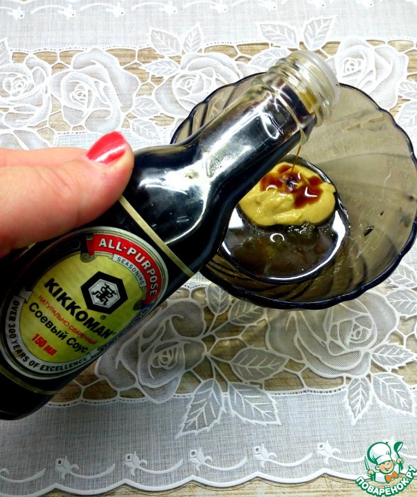 Приготовить заправку 1. Смешать мед (если густой предварительно растопить), соевый соус и горчицу.