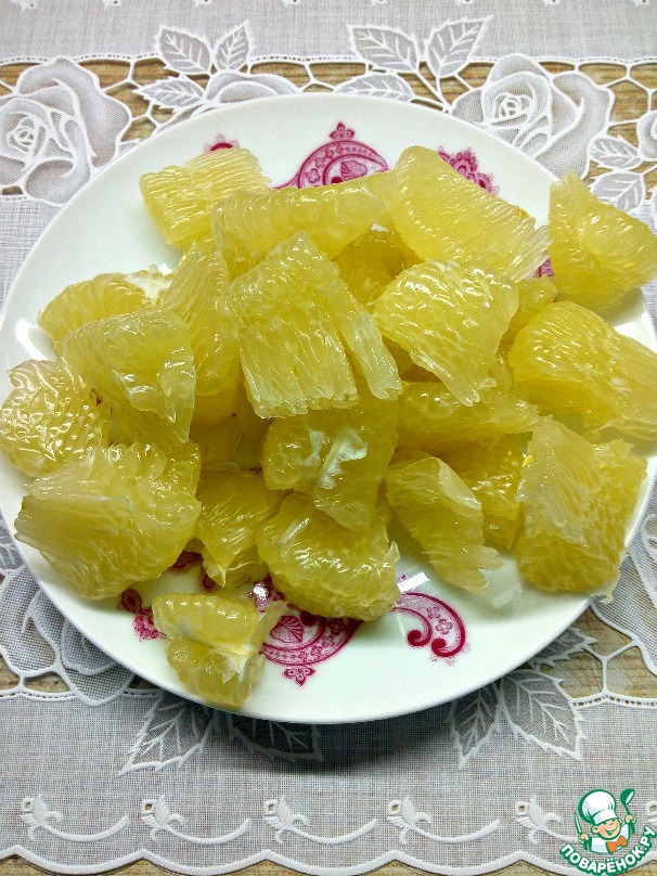 Памело очистить от кожуры и пленочек, разделить каждую дольку на 3-4 части.
