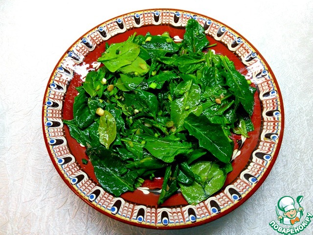 Шпинат и зеленый лук вымыть. Лук мелко порубить, листья шпината оставить целиком. Смешать листья шпината и лук, выложить на блюдо, полить заправкой 2.