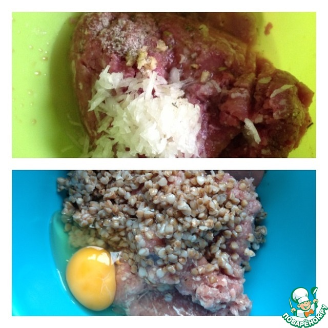 В фарш добавить 50 мл холодной воды, специи, чеснок пропущенный через пресс, 1 шт лука натереть на мелкой терке. Вымесить фарш. Добавить яйцо и остывшую гречку, еще раз вымесить фарш.