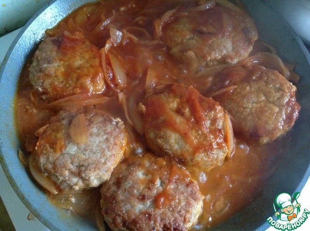 К котлетам выложить нашу томатную зажарку, сковороду накрыть крышкой и на медленном огне тушить котлеты минут 20.
