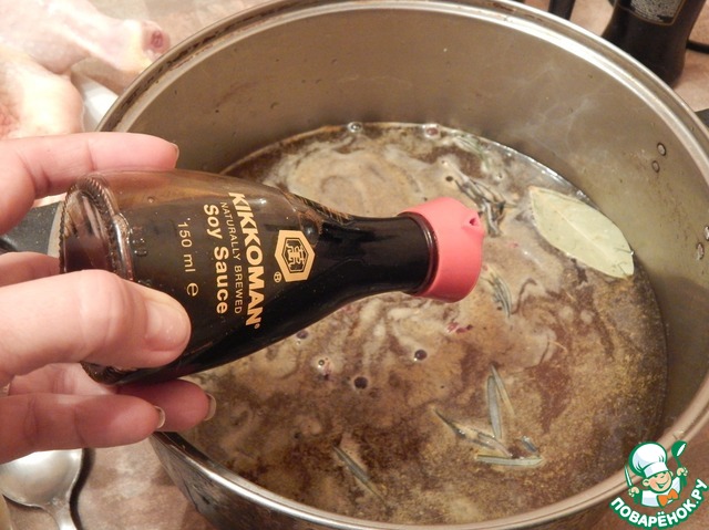 В кастрюлю налить 3 литра воды добавить соль, сахар, все специи из графы "рассол", влить 150мл соевого соуса "Киккоман"