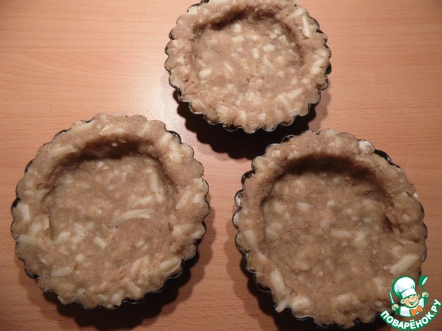 Формы для тарталеток смазать сливочным маслом, выложить в них хлебное тесто, сделав бортики. Выпекать в прогретой до 180° духовке 10–15 минут, остудить.