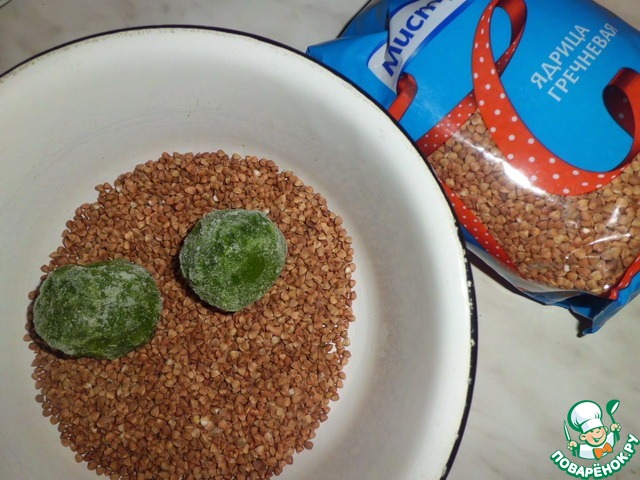 Гречневую крупу от "Мистраль" залить стаканом кипятка, туда же сразу отправить шпинат (у меня он уже измельчен). Посолить, накрыть крышкой и укрыть полотенцем.