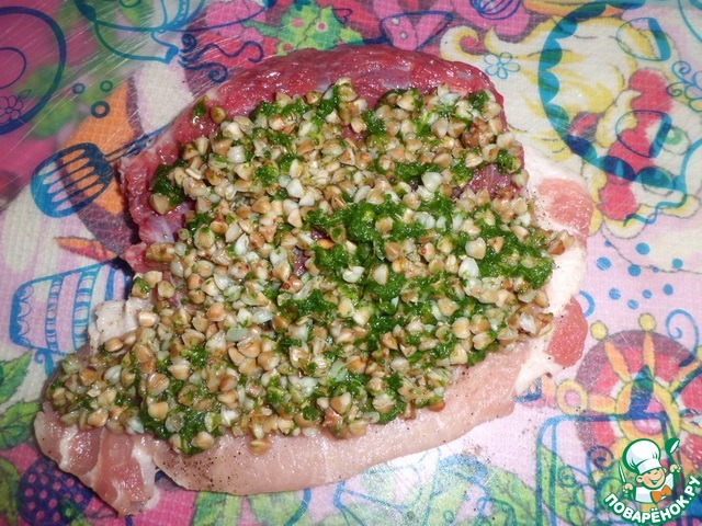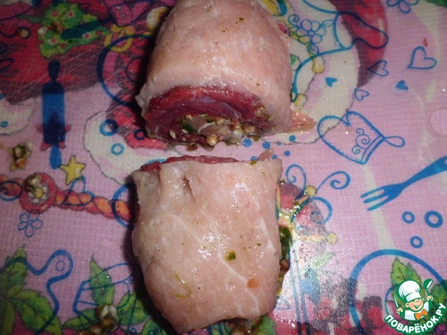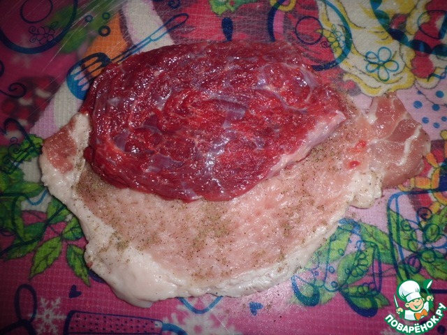 Свинину и говядину нарезать на пласты, примерно 0,7 мл. Хорошо отбить. Пласты говядины должны быть меньше свиных. Берем один пласт, солим, перчим, выкладываем на середину другой, так же солим и перчим.