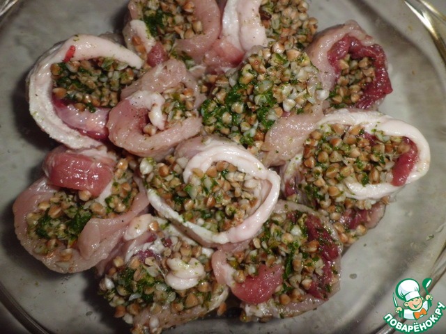 Выкладываем слой гречневой крупы (она постояла около 20 минут, пока шла нарезка и отбивание мяса).