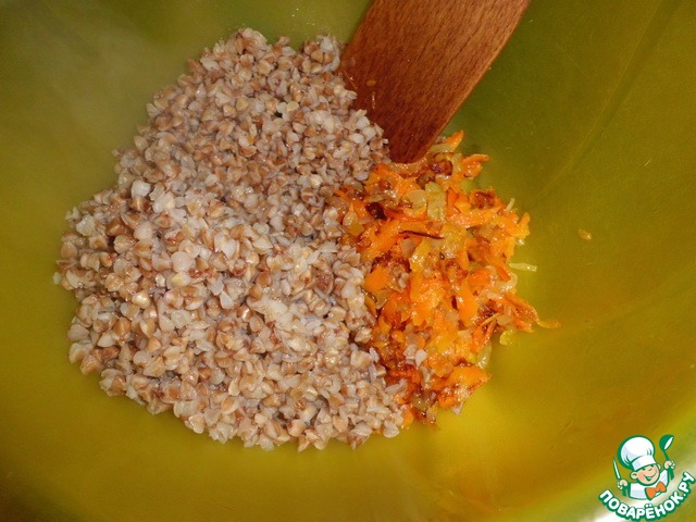 Лук с морковью обжариваем на среднем огне до полуготовности. Смешиваем с гречневой кашей. Солим, перчим.
