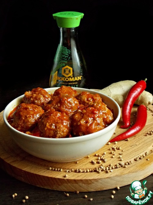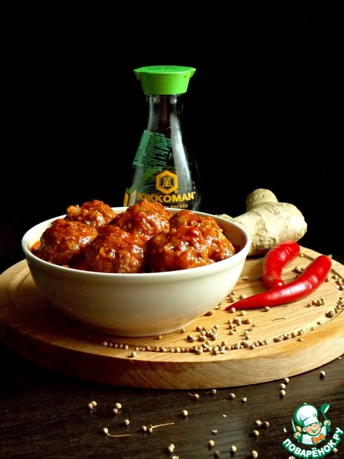 Добавить специи, имбирь, томаты и перемешать. Влить бульон и потушить несколько минут. Кладем в соус фрикадельки и прогреваем их в течение 10 мин. на слабом огне.