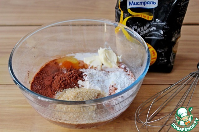 Для этого в миске смешать мягкое сл масло, яйца, молоко, сахар демерара ТМ Мистраль, какао порошок, муку, разрызлитель и молоко.