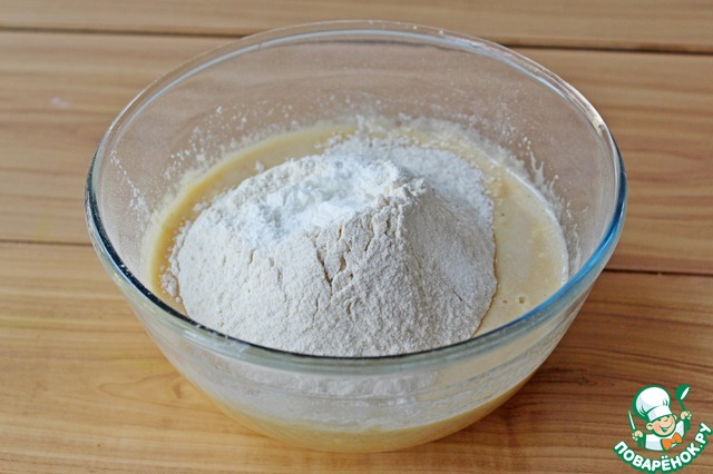 Добавить просеянные муку и разрыхлитель и перемешать до однородности.