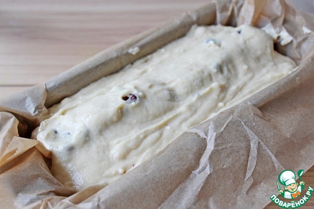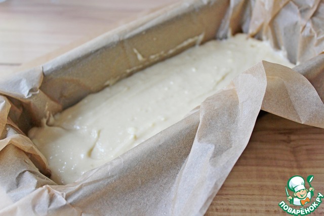 Форму для кекса выстелить пергаментом и вылить половину теста для кекса.