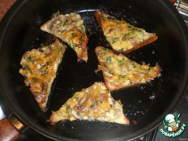 Выкладывайте на сковородку сначала стороной, покрытой сырной массой.