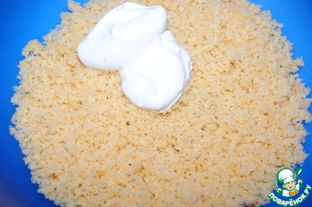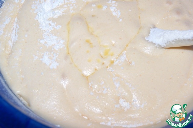 Просеять вместе муку, крахмал и разрыхлитель и добавив к взбитой массе 1/3 часть, аккуратно перемешать лопаткой методом складывания снизу вверх и по кругу.