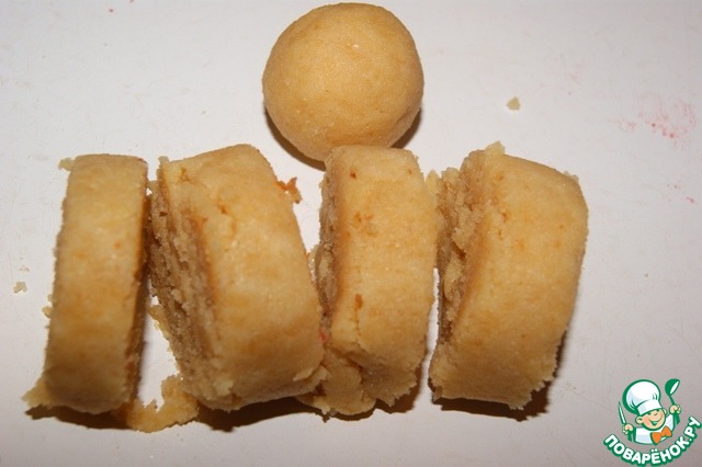 Разрезать охлажденную массу на 8 частей. Две части отложить в сторону (я сделала еще большого снеговика и добавила к массе верхнюю засахаренную корочку от бисквита, вы можете приготовить 8 попсов). Из 6 частей скатать гладкие и плотные шарики и поместить их в холодильник на 20 минут.
