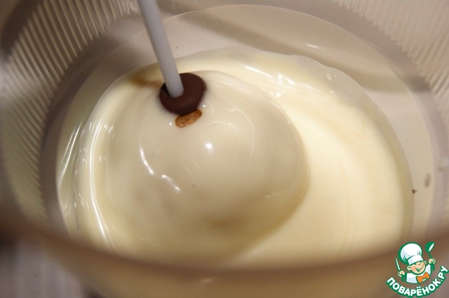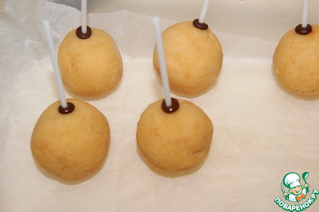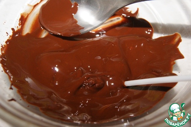 Растопить шоколад. Приготовить палочки. Достать шарики из морозильной камеры. Окунуть палочку в растопленный шоколад.