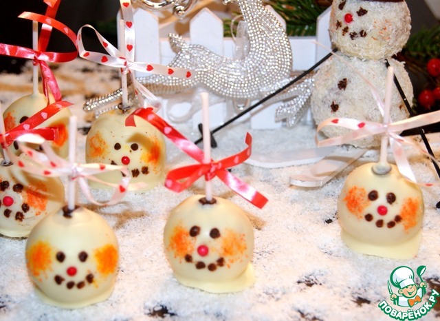 Так же поступить с 2 шариками для большого снеговика. Отправить все попсы в холодильник на 15 минут.