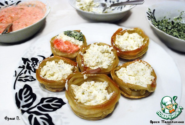 Каждую тарталетку заполняем с горкой белой начинкой с сыром и оливками. По краям выкладываем зеленую и красную.