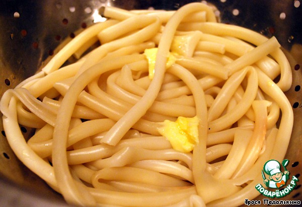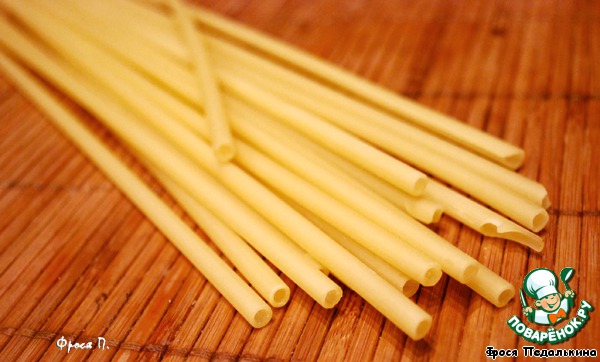 Толстые спагетти отварить согласно инструкции. Чем толще, тем проще работать с ними.
