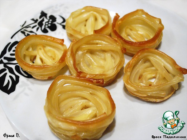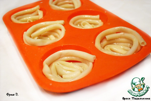 Выложить спиралью в форму для маффинов. По 3 макаронины на тарталетку примерно. На дне зазор тоже прикрыть кусочком спагетти. Полить оставшимся яйцом. Запекать при темп.180-190 гр 15-20 минут пока не подрумянятся.