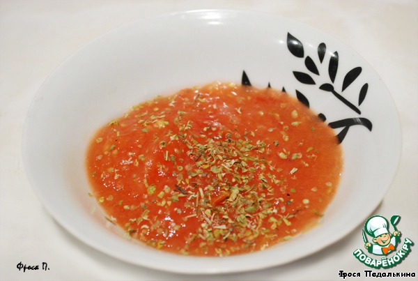 Помидор надрезать крест-накрест, опустить в кипяток на 30 сек, снять кожицу. Мелко порубить, посыпать орегано, слегка посолить.