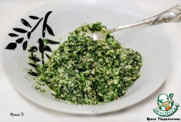 Для песто - измельчаем в ступке или в блендере кедровые орехи, чеснок, 30 г сыра, листья базилика. Постепенно добавляем оливковое масло, солим, перемешиваем.