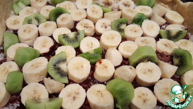 Очищаем и нарезаем бананы и киви. Киви очень хорошо добавляют кислинку. Выкладываем на шоколадный слой.