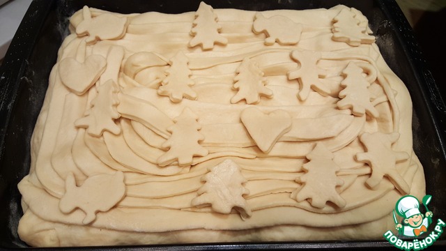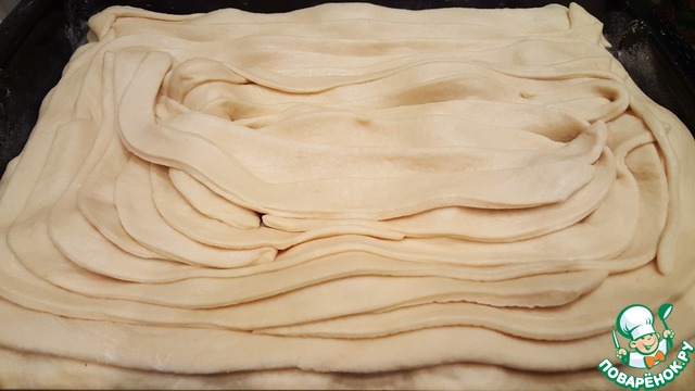 Я делала тесто немного с запасом, чтобы вырезать немного булопеченек мелкому. Иначе приходится обрывать пирог)))