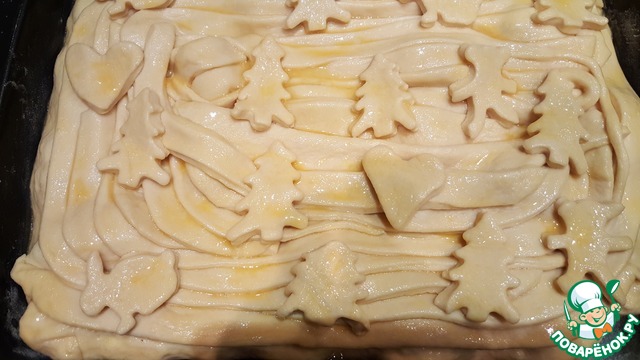 Защипляем боковины. Раскатываем второй кусочек теста. Мне нравится нарезать на полоски и выкладывать их по настроению. Сегодня настроение зимнее. Полоски выкладывала вдоль, как сугробы.