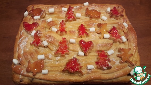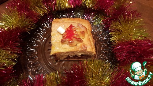 Ставим пирог в разогретую духовку на ~40 минут. Ориентируйтесь на Вашу духовку!!! Пирог испёкся!!! Поскольку он Новогодний, да ещё и сюрприз, я решила ещё немного его украсить!