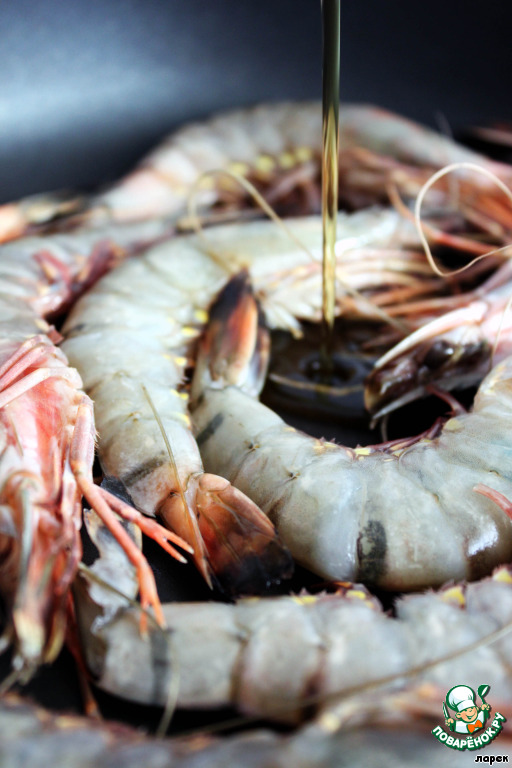 Нам понадобятся серо-зеленые (они сырые, а не варено-мороженые розового цвета), королевские креветки (в моем случае - калибр 18-20). Креветки обжарить на оливковом масле до готовности (5-7 минут)